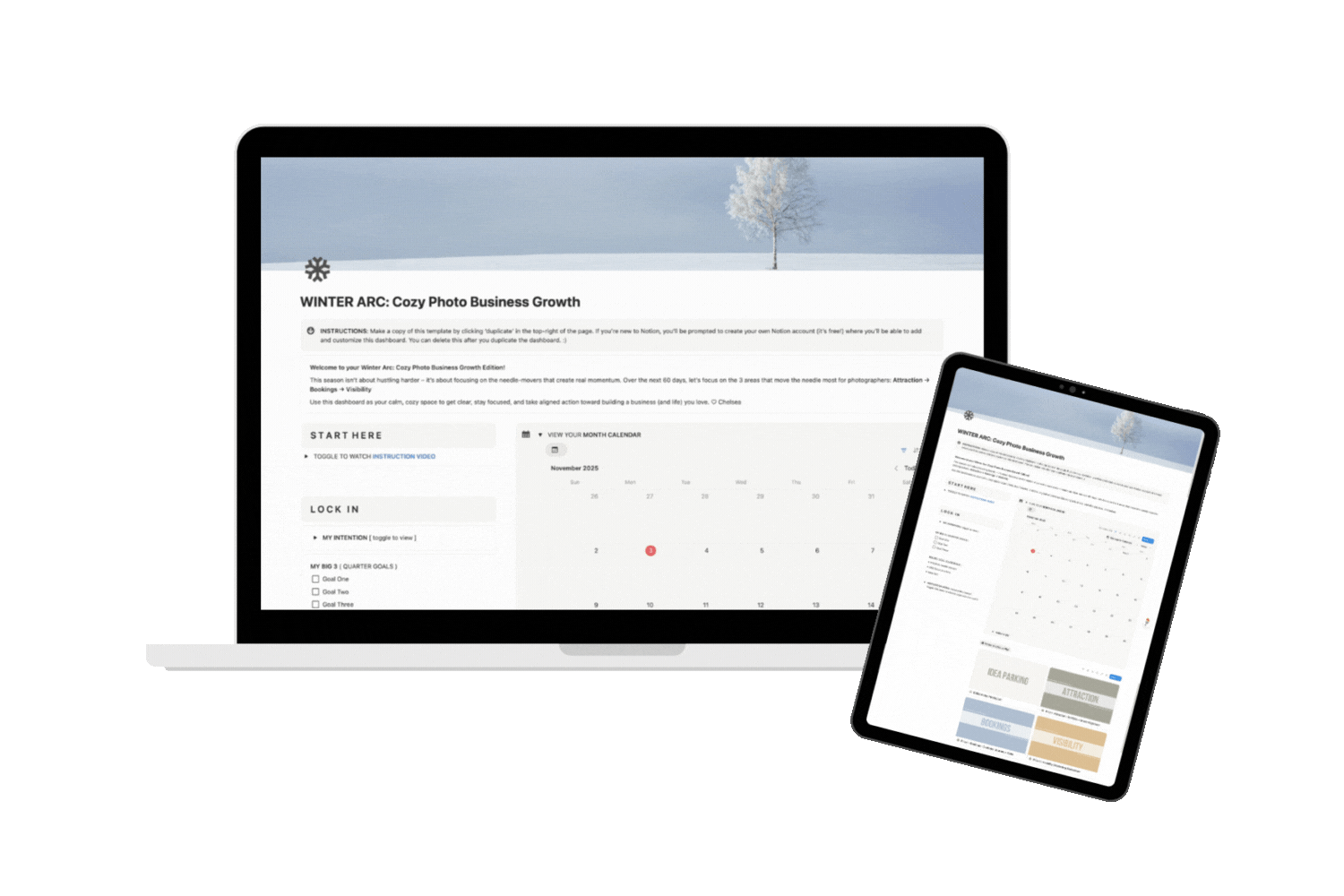 A cozy, clarity-giving Notion dashboard designed to help you stay organized and intentional, and build momentum toward consistent bookings + the clients you love.
